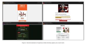 Os pesquisadores da Check Point Software detectaram 33.502 e-mails de phishing com temática de Natal apenas nas últimas duas semanas, além de mais de 10.000 anúncios falsos sendo criados diariamente em canais de redes sociais. Muitos imitam promoções festivas, enquanto outros divulgam ofertas falsas do Walmart ou da Home Depot, apelos fraudulentos de caridade e notificações urgentes de entrega.
