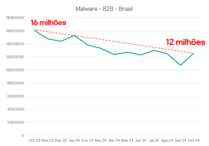 O volume de ataques de malware detectados nos últimos 12 meses equivale a 331 tentativas de ataques por minuto. Essa quantidade, embora apresente uma tendência de queda, demonstra a persistência da ameaça. Os setores mais afetados no Brasil são os de indústria (28%), Governo (17%) e Agricultura (13%). De acordo com especialistas da empresa, o novo panorama pode indicar uma mudança de foco dos cibercriminosos para a realização de uma quantidade menor de ataques, porém mais lucrativos.