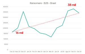 O ransomware, que criptografa dados e exige resgate, continua sendo uma ameaça extremamente séria com mais de 306 mil ocorrências no ano (840 por dia). No gráfico, os especialistas mostram que há uma tendência de alta – o que é muito preocupante para as organizações que podem ter sua operação paralisada e a geração de exposição negativa.