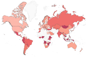O mapa a seguir exibe o índice de risco global (vermelho mais escuro = risco mais alto), demonstrando as principais áreas de risco ao redor do mundo.