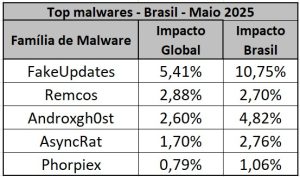 No Brasil, em maio, o ranking nacional de ameaças listou os mesmos malwares e nas mesmas posições que o global: o malware FakeUpdates liderou o índice nacional de ameaças com impacto de 10,75%; o segundo malware que mais impactou as organizações no Brasil foi o Remcos com índice de 2,70%, e, em terceiro, o Androxgh0st registrou impacto foi de 4,82%.