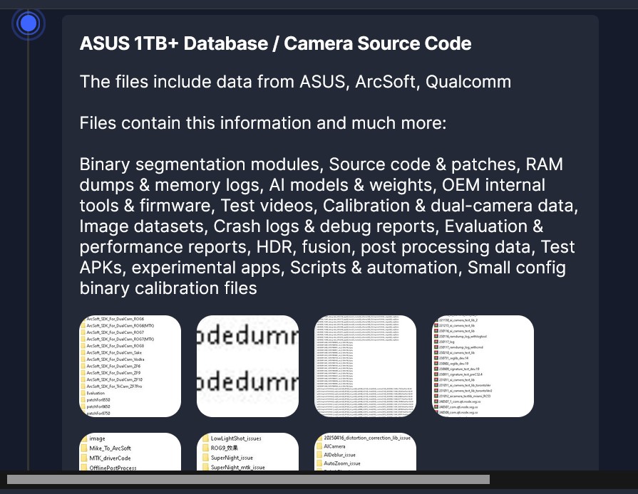 O grupo de ransomware Everest divulgou capturas de tela como suposta prova da invasão de 1 TB a sistemas da ASUS, expondo arquivos internos altamente sensíveis que não haviam sido divulgados anteriormente. O material vazado inclui o código-fonte completo relacionado à câmera, patches internos, módulos de teste e registros de depuração.